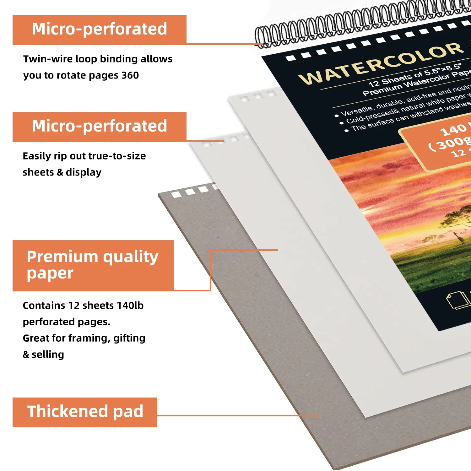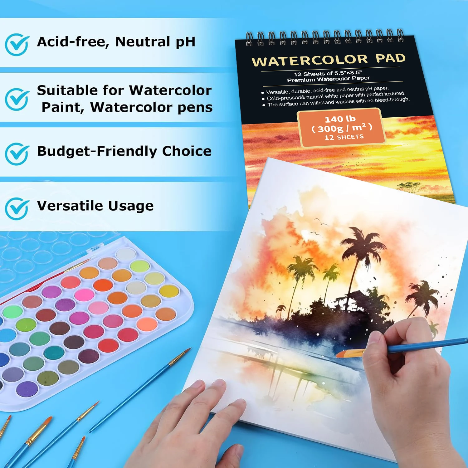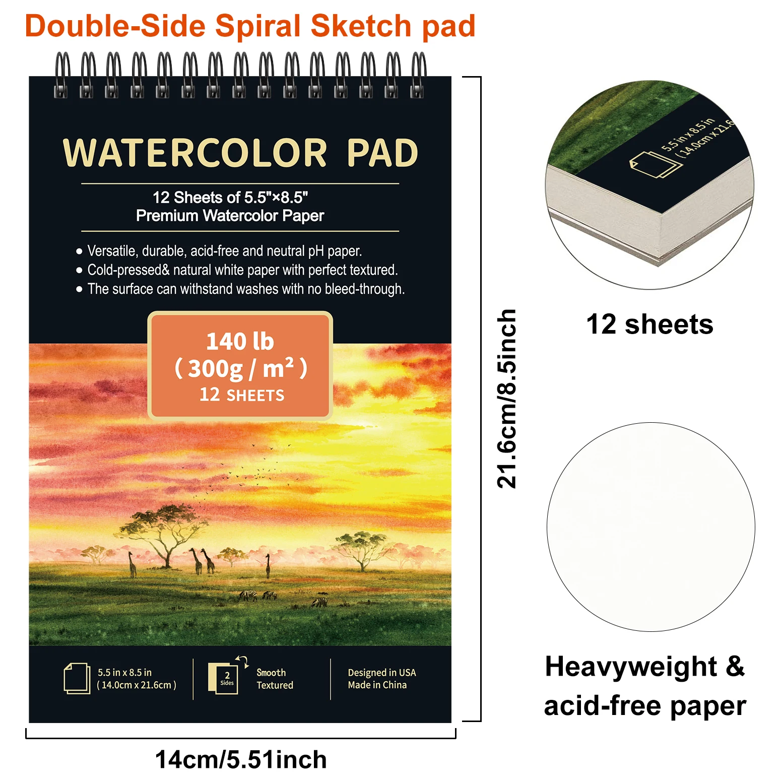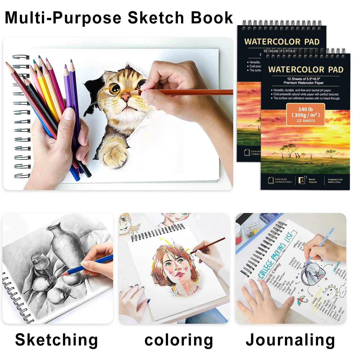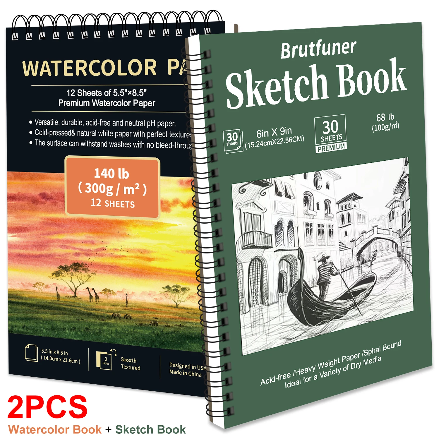 2pcs/A5 Watercolor Sketchbook 5.5 x 8.5 Inch, Watercolor Paper Cold Press (140lb/300gsm), Spiral Bound Water Color Pad