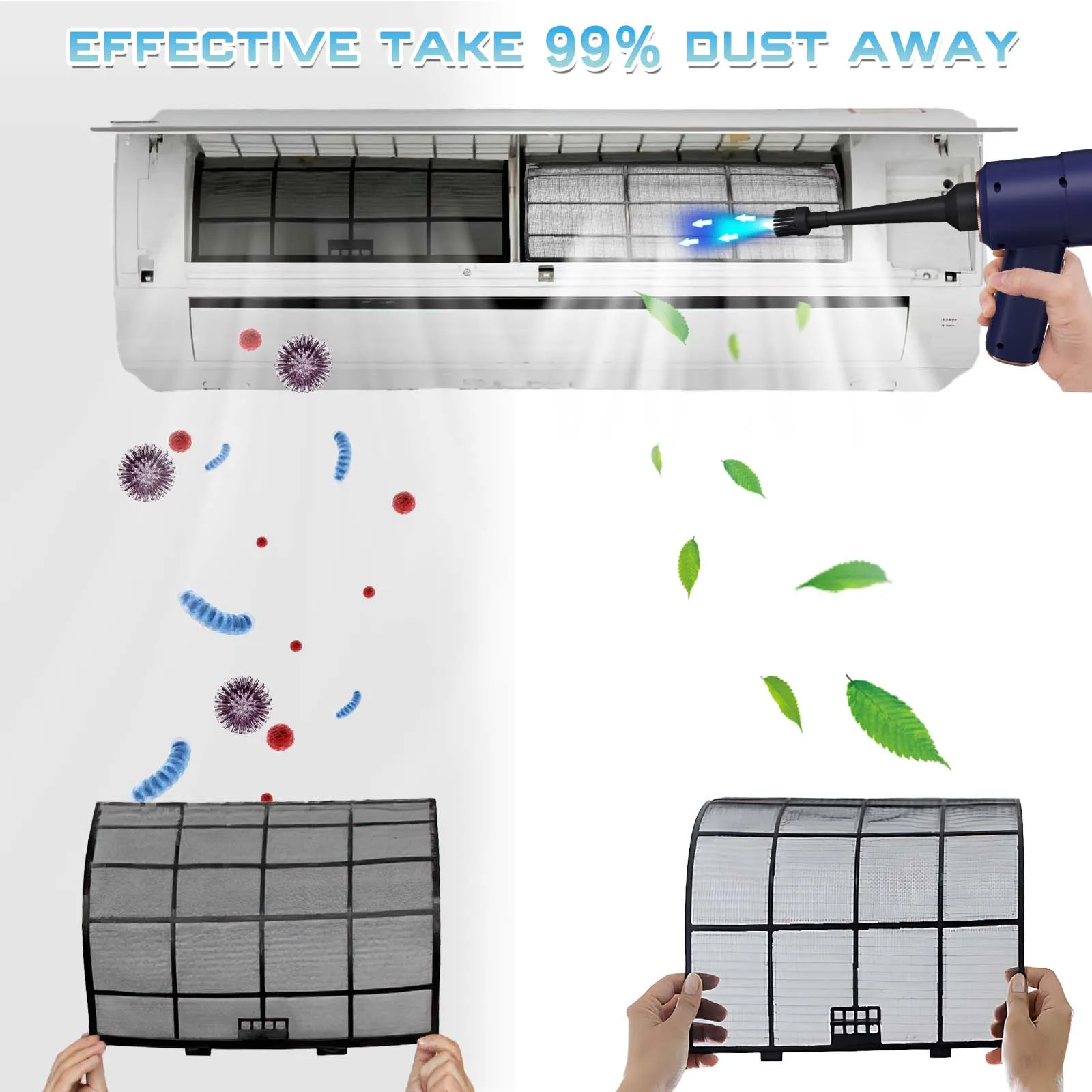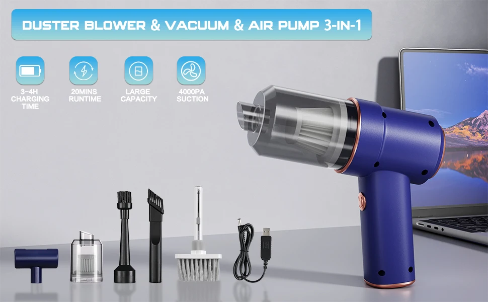 3-IN-1 ELECTRIC AIR DUSTER & VACUUM CLEANER Our Electric Compressed Air Duster equivalent of buying a compressed computer air duster, a mini vacuum cleaner, an air blower, uncountable air cans and cleaning gel at a time. Say goodbye to disposable air cans from now. It is more energy-efficient and environmentally