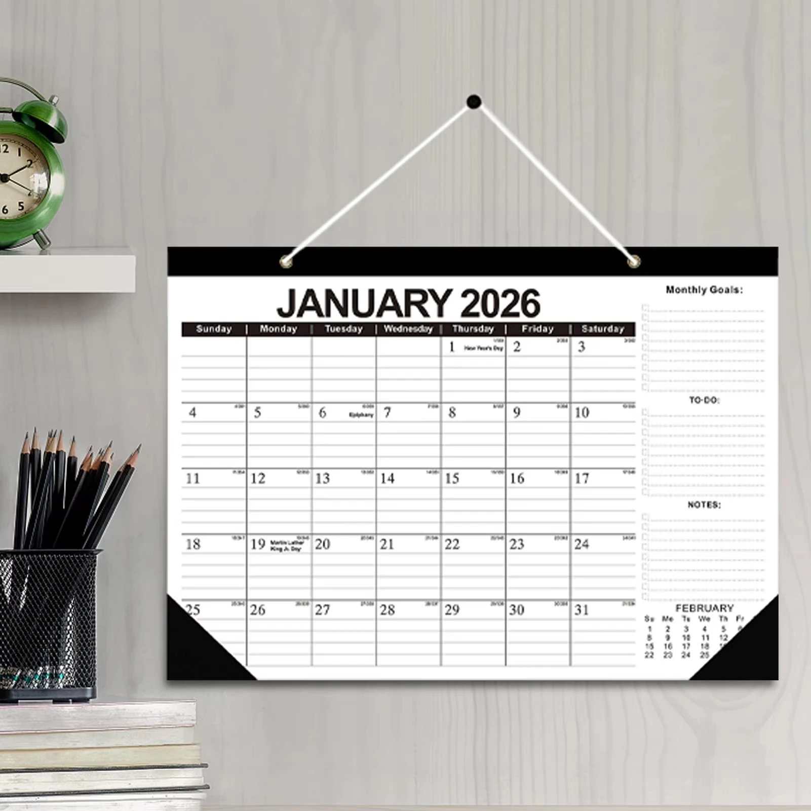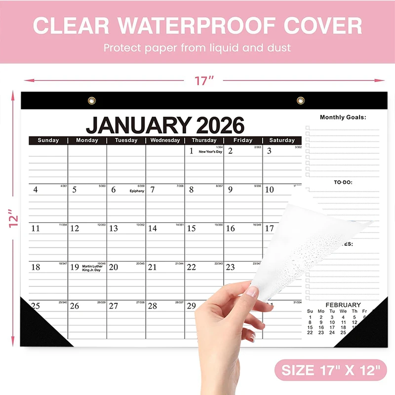 The calendar's paper material keeps your plans legible and organized, and the black hardcover backing provides protection and allows for easy writing.