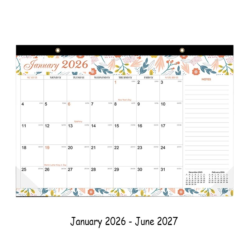 The 2026-2027 desk calendar covers 18 months, from January 2026 to June 2027.