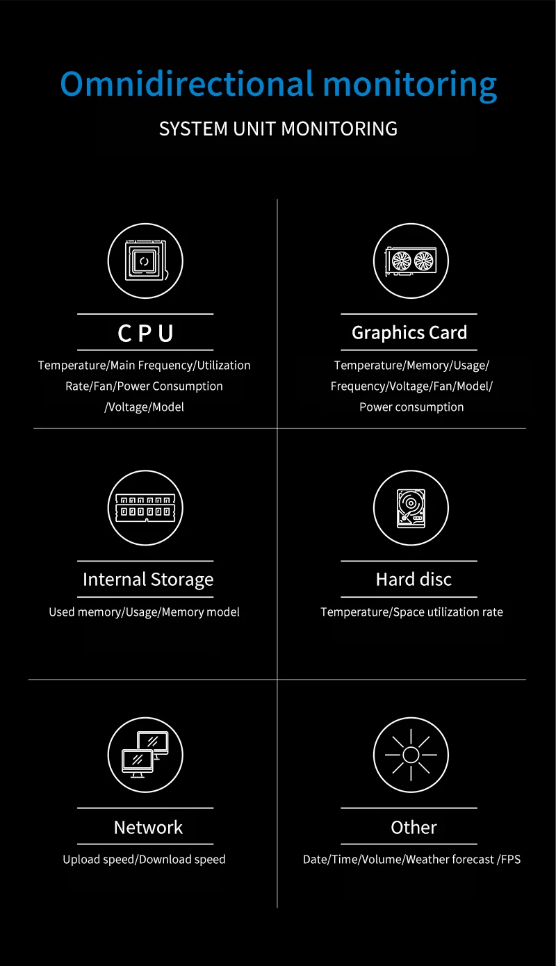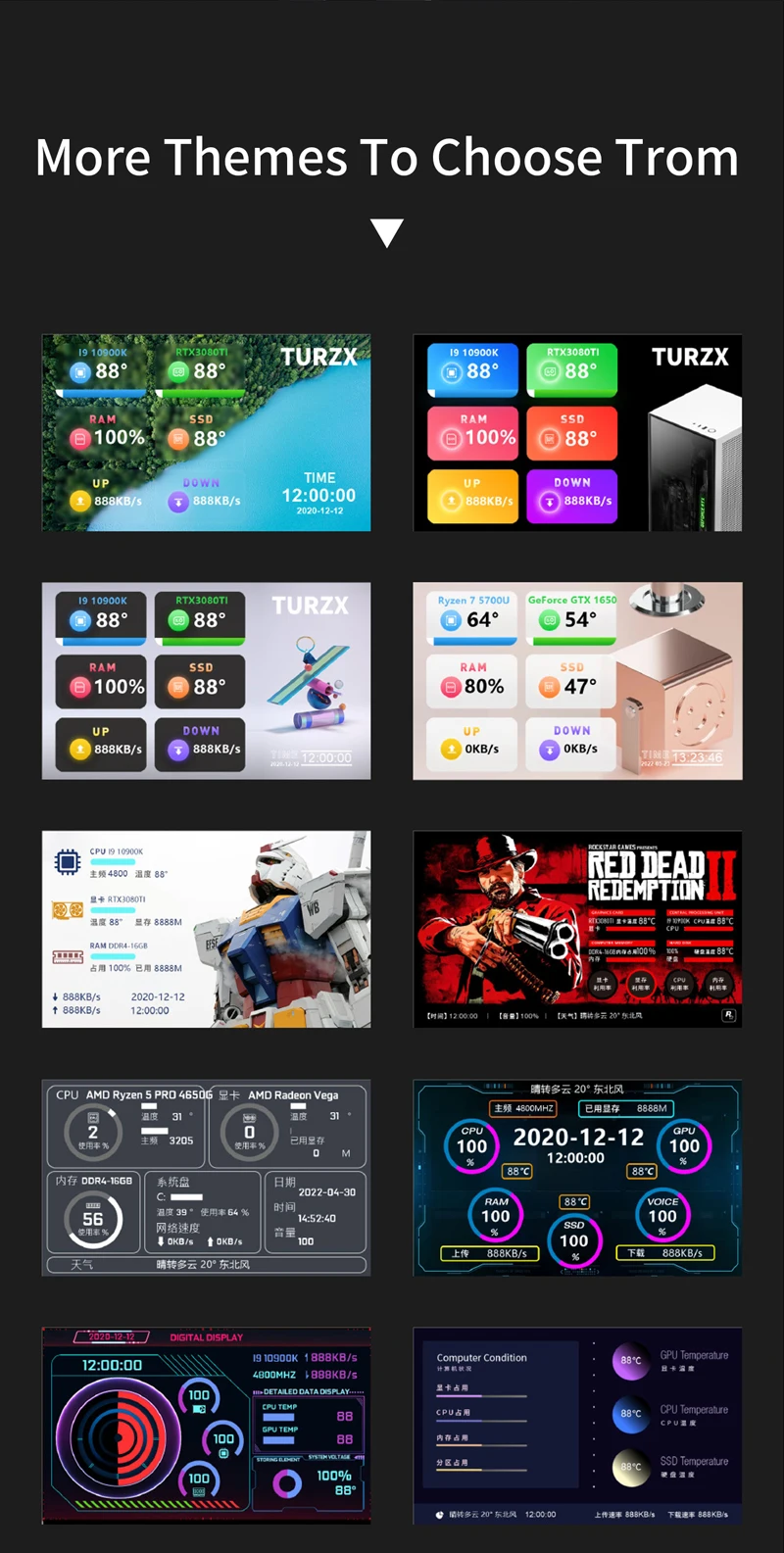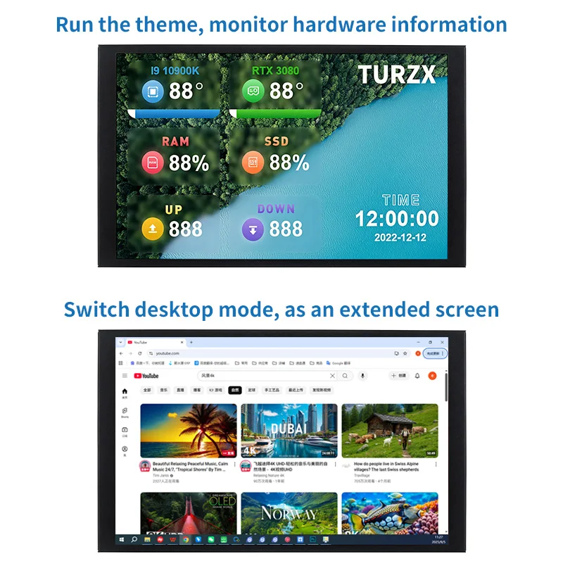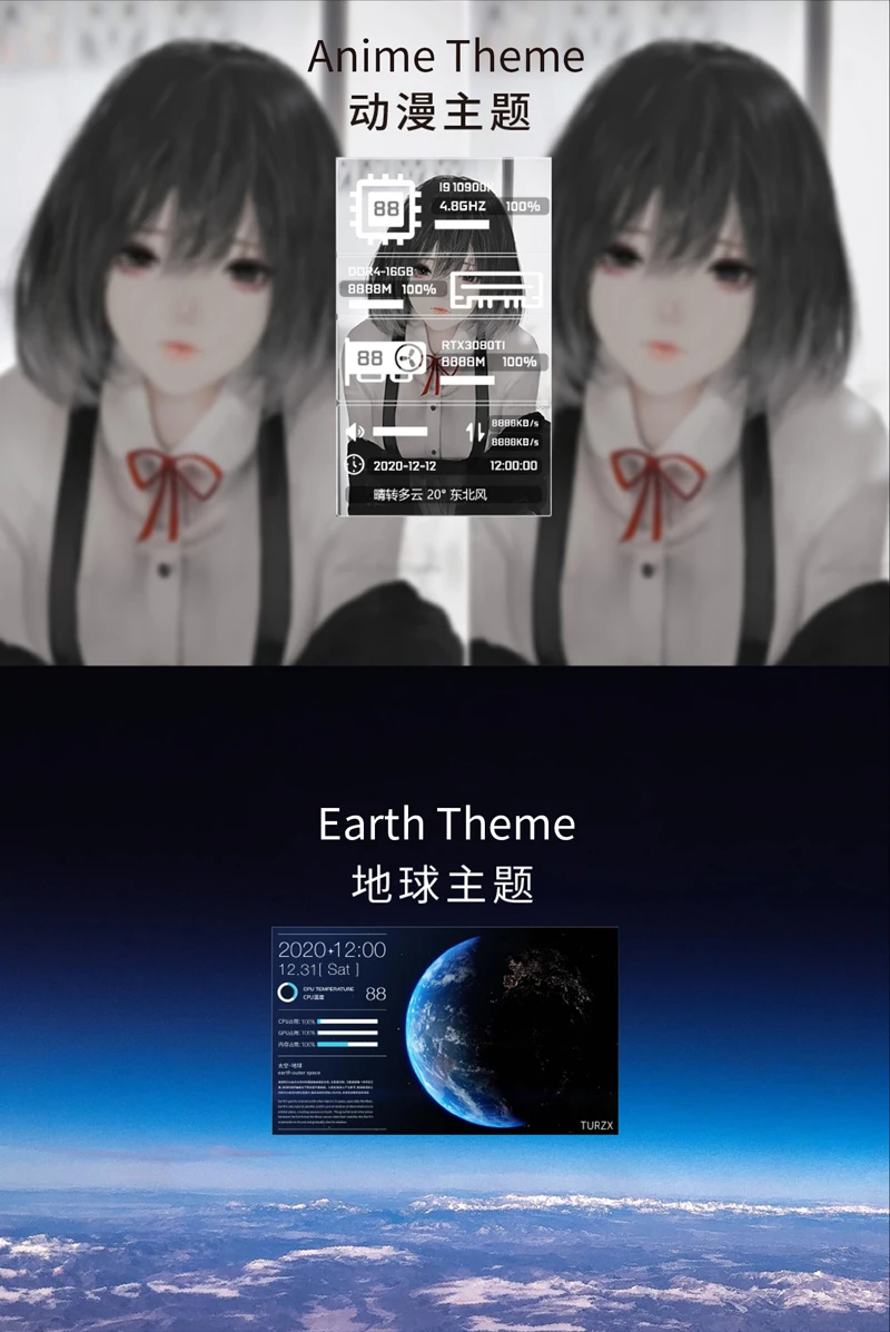 1. Only support use with self-developed software (TURZX),does not use AIDA64, and takes up less resources, need not HDMI-compatible cable.Support setting dynamic videos as theme backgrounds.