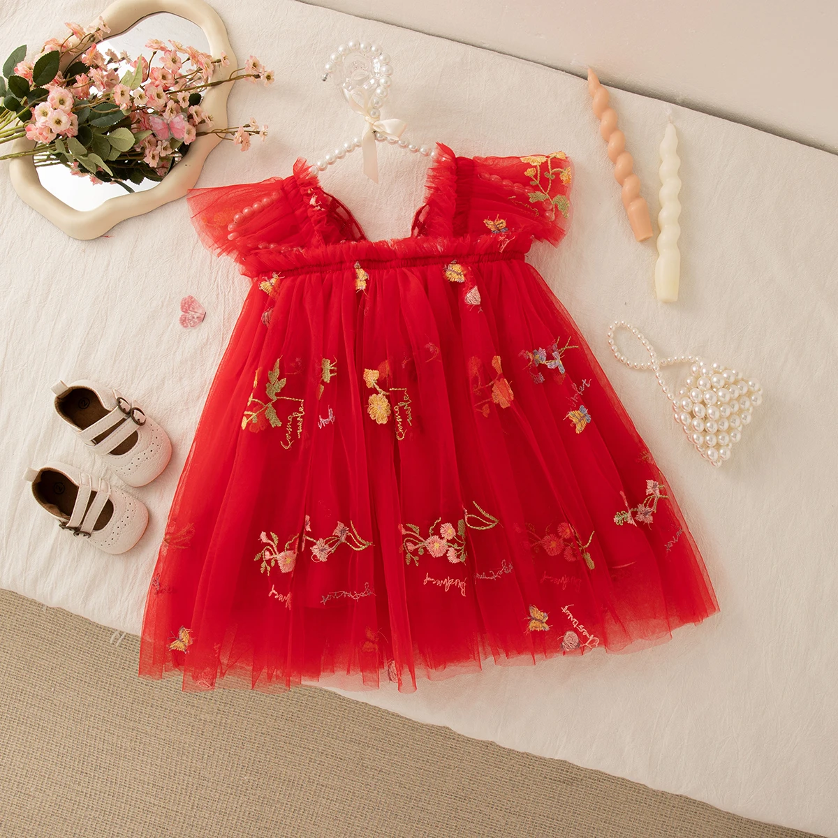 Summer New Floral Embroidery Chiffon Baby Girl Princess Dress, Cute Butterfly Wing Children’S Clothing (9 Months – 4 Years Old)