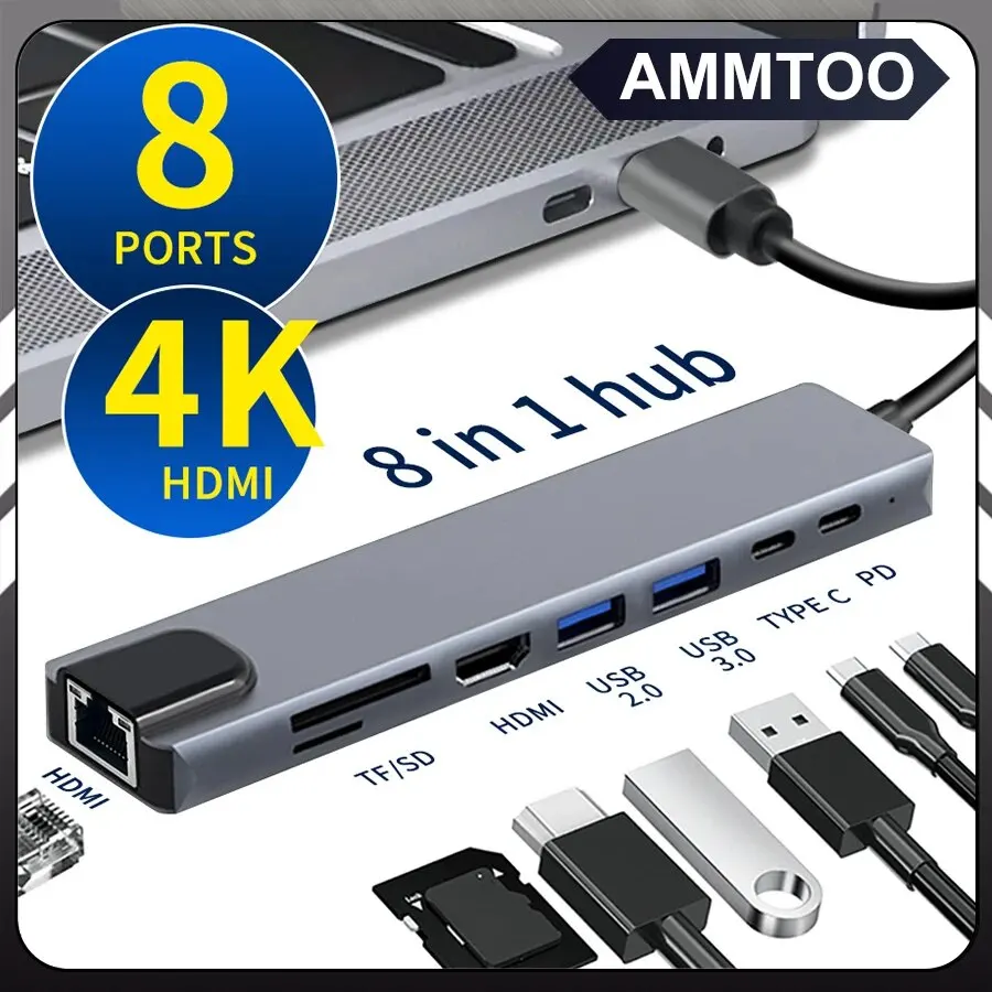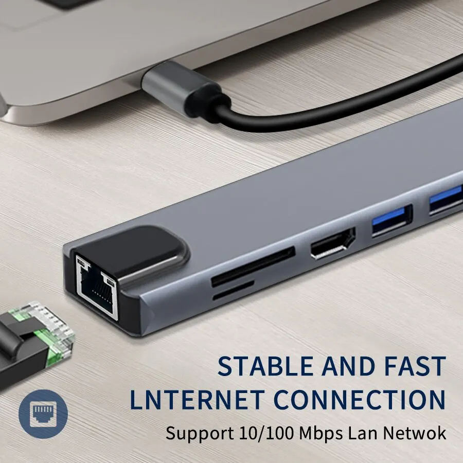• 8-in-1 Functionality :This USB C hub offers 8-in-1 functionality, combining HDMI-Compatible, card reader, RJ45, and USB Type-C interfaces in one compact device.